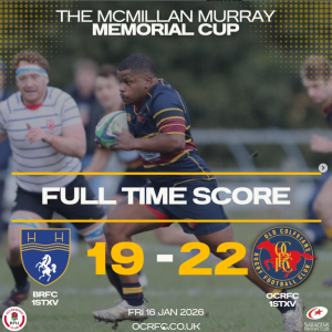 Finally, good attacking pressure is applied from OCs. Josh Doughty gives the ball from the breakdown & three passes from OCs forwards shifts the ball 3/4s of the width of the pitch, allowing Brendon to secure the Hat Trick. 59-7.